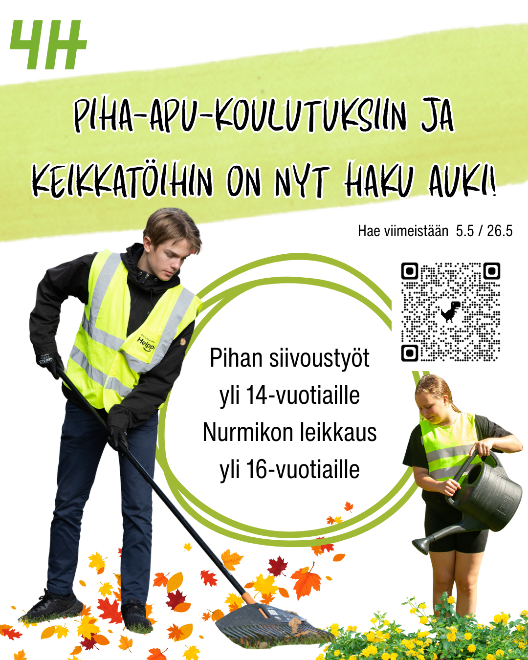 Hae mukaan 4H-keikkatöihin! Jos olet 15-22-vuotias reipas ja oma-aloitteinen, haluaisit tehdä työtä ympäri vuoden lomilla ja koulun/opiskeluiden ja harrastusten lomassa, hae mukaan 4H:n keikkatöihin!